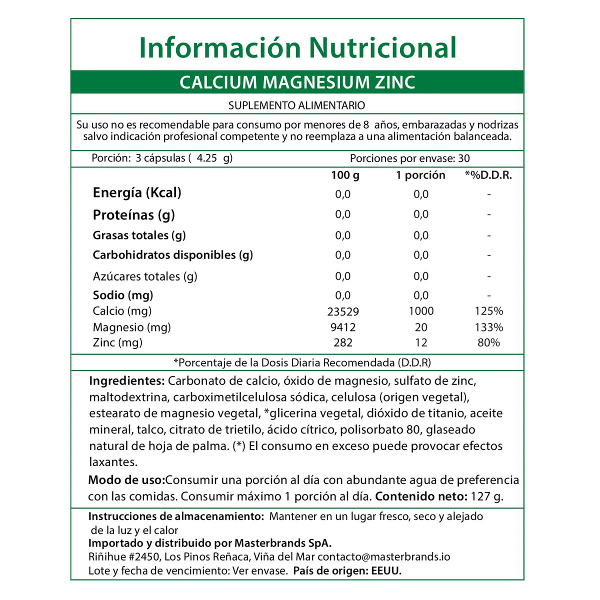 Carbonato de calcio, óxido de magnesio, sulfato de zinc, maltodextrina, carboximetilcelulosa sódica, celulosa (de origen vegetal), estearato de magnesio vegetal, glicerina vegetal, dióxido de titanio, aceite mineral, talco, citrato de trietilo, ácido cítrico, polisorbato 80 y glaseado natural de hoja de palma.
