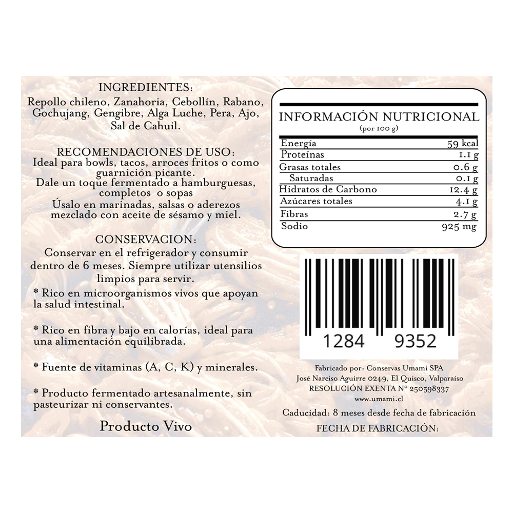 Nuestro Kimchi Artesanal es un alimento vivo, 100% vegano, sin gluten y sin aditivos , elaborado mediante fermentación tradicional con repollo chileno fresco , zanahoria, gochujang, jengibre, alga luchi, pera, ajo y sal de Cahuil . Cada lote mantiene su carácter auténtico: picante, crujiente y lleno de vida. 🥬🔥✨