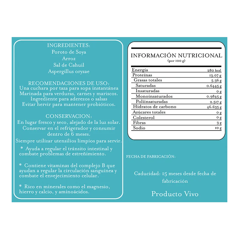 Poroto de soya • Arroz koji (Aspergillus oryzae) • Sal de Cahuil